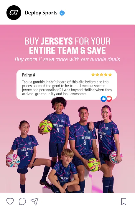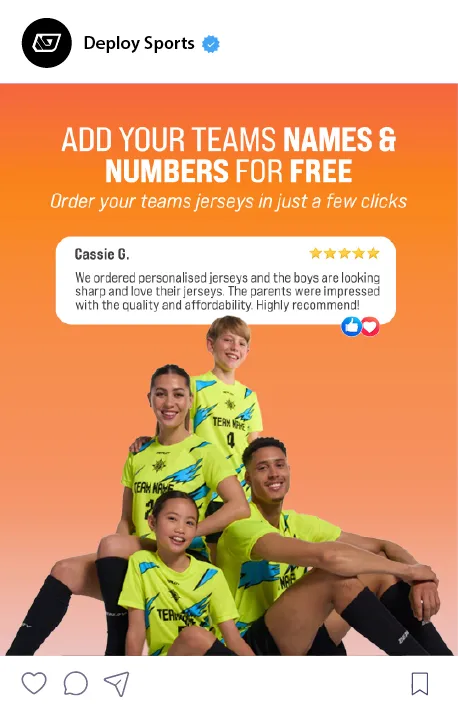 In Australia, casual Summer Sport is increasing in popularity, with friends getting together to create their own teams and join summer competitions across Soccer, Basketball, Touch Football and Oz Tag. Deploy’s Summer Sports Campaign allows teams to order their own jerseys with their teams player names, numbers and team names. This campaign is aimed at promoting Deploy’s summer jerseys and the capability of their online platform to make the ordering process easier for teams and parents.
